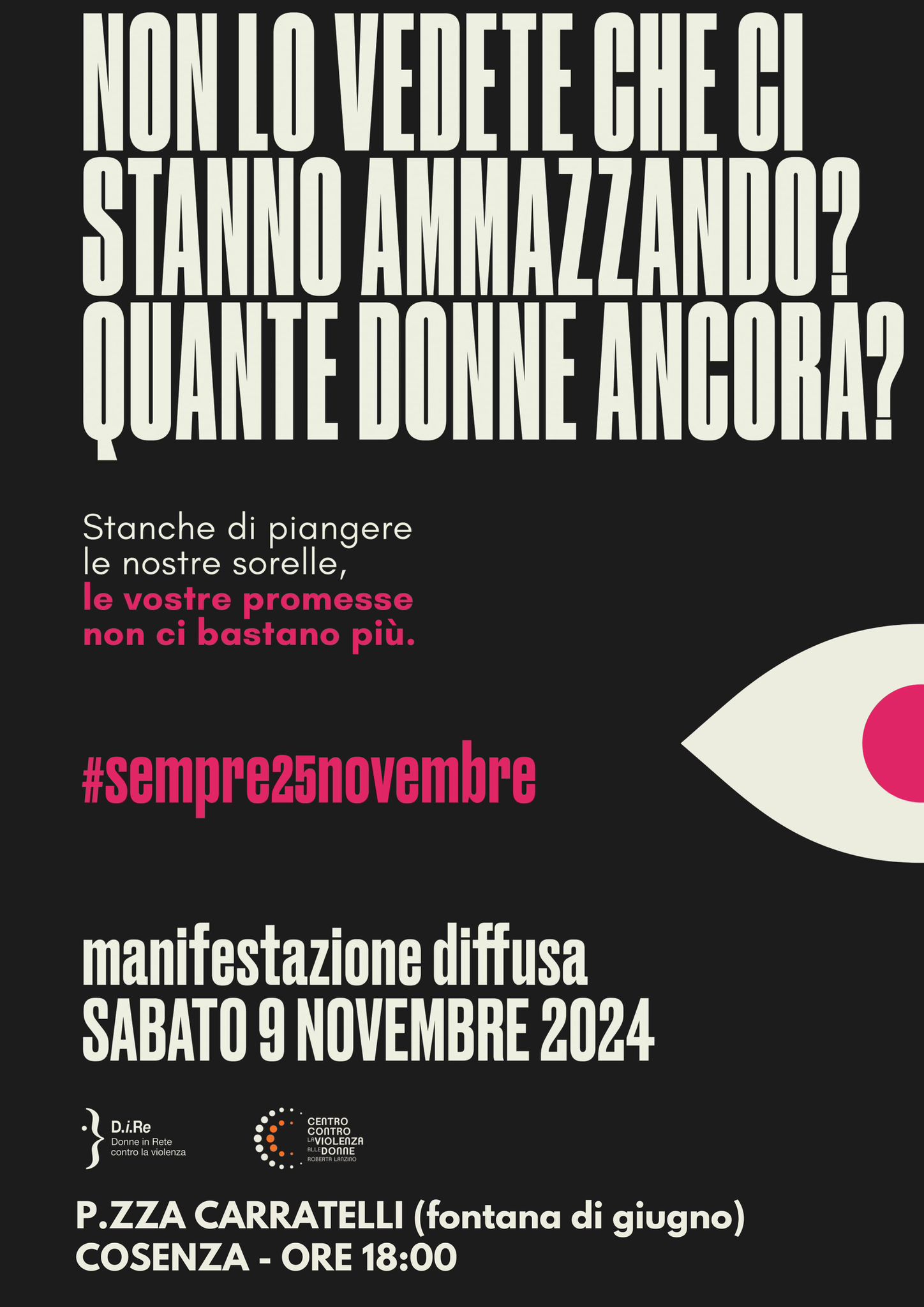 La di Cosenza sarà parte di una mobilitazione che vedrà le attiviste della rete DiRe presenti in diverse città italiane. Il flash mob punta a dare visibilità e attenzione al problema della violenza di genere attraverso l’occupazione di spazi pubblici, per ribadire il diritto delle donne a vivere in sicurezza. “Siamo stanche di piangere le nostre sorelle; le vostre promesse non ci bastano più”, si legge nel comunicato del Centro, che denuncia la mancanza di un piano nazionale strutturato contro la violenza di genere. Questa mobilitazione intende, quindi, sottolineare l’urgenza di un cambiamento concreto e radicale, che mette fine alla tragica frequenza dei femminicidi in Italia.
