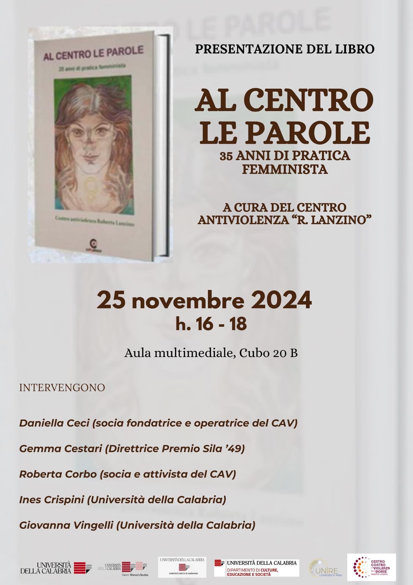 Proprio “Al centro le parole”, il volume che racchiude gli anni di attivismo da parte del CAV, tra i primi in Italia, sarà presentato il 25 novembre all’Università della Calabria, alle 16,00 nell’aula multimediale del cubo 20 B.