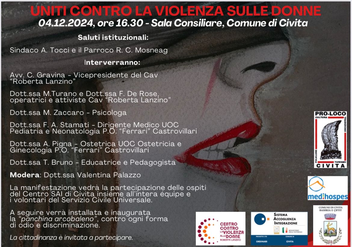 Diverse le iniziative previste in provincia: il 25 a Lungro alle 17,30 nella Casa della musica le attiviste parteciperanno alla iniziativa promossa dall’amministrazione comunale e il 4 dicembre parteciperanno al convegno organizzato dal comune di Civita “Uniti contro la violenza sulle donne” nella sala consiliare sole 16,30.