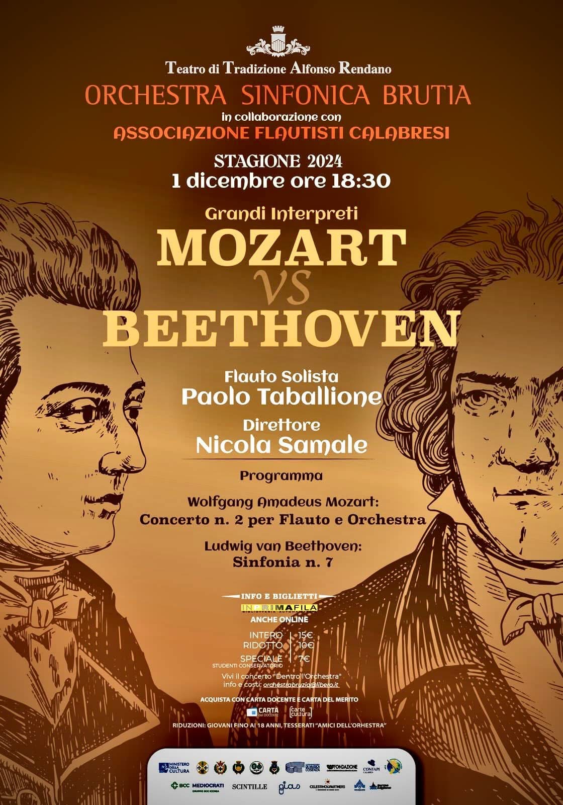 Oggi, domenica 1° dicembre, alle ore 18:30, il Teatro di Tradizione Rendano di Cosenza ospita un nuovo appuntamento della rassegna “I grandi concerti del Rendano”. Protagonisti della serata saranno Wolfgang Amadeus Mozart e Ludwig van Beethoven , con un programma che celebra il repertorio classico tra fine Settecento e inizio Ottocento. L’Orchestra Sinfonica Brutia (OSB), diretta dal maestro Nicola Samale , proporrà il Concerto n. 2 per flauto e orchestra di Mozart e la Settima Sinfonia di Beethoven , due opere che mettono in luce la ricchezza e la profondità del classicismo viennese.