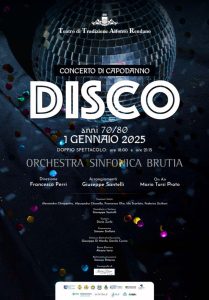 Il giorno di Capodanno saranno due gli spettacoli previsti, il primo alle 18,00 e il successivo alle 21,15. L’OSB, con 40 musicisti e la direzione del maestro Francesco Perri, si trasformerà in ritmico-sinfonica con 5 solisti (Alessandro Chiappetta, Alessandra Chiarello, Francesca Olia, Ida Scarlato e Federica Siciliani), un corpo di ballo e gli arrangiamenti originali di Giuseppe Santelli. “Disco”, questo il suo titolo, non è solo un concerto, ma un tributo a un’epoca iconica, quella degli anni ‘70 e ‘80, un modo per celebrare la disco music attraverso la radio in occasione del suo centenario. Un’esperienza che sarà ricordata a lungo e che si fonderà sul potere trascinante della musica che unisce le persone, superando generazioni e culture. A condurre il tutto, on air, come se si trattasse di una trasmissione radiofonica, un nome importante ed apprezzato della radio a Cosenza, come Mario Tursi Prato. Gli anni ‘70 e gli ‘80 erano gli anni in cui la musica aveva ancora il sapore della genuinità, trasmessa com’era anche dalle radio locali. Una musica che ha sfidato i decenni, che ha espresso valori ed idee rivoluzionari, che ha fatto innamorare migliaia di persone e che era fatta proprio da persone e non da macchine. Il concerto “Disco” ripropone, con gli arrangiamenti originali di Giuseppe Santelli, la musica americana dei Commodores, di Michael Jackson, dei Toto e quella di Elton John, dei Bee Gees (indimenticati protagonisti di quell’autentico miracolo discografico e cinematografico, che va sotto il nome di “Saturday Night fever”), ma anche le dolci e immarcescibili melodie di indiscussi esponenti del cantautorato italiano come Lucio Battisti, Sergio Endrigo e Gino Paoli. Insomma, sarà un concerto straordinario ed imperdibile. L’idea dello spettacolo, una produzione originale dell’OSB, potrà sembrare alquanto insolita, per il fatto di far suonare da un’orchestra sinfonica il repertorio della disco music, ma non si esclude che il repertorio prescelto possa trascinare gli spettatori a ballare e a muoversi come in una discoteca. Si accettano scommesse!