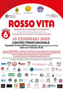 La piazzetta antistante il Centro trasfusionale dell’ospedale civile dell’Annunziata di Cosenza ospiterà, domenica 16 febbraio, la sesta edizione di Rosso Vita, l’evento dedicato alla promozione della donazione di sangue e midollo osseo. L’iniziativa, organizzata dalla Apdem onlus con la direzione artistica di Rosa Martirano (M-Art) , si avvale della collaborazione dell’Azienda ospedaliera dell’Annunziata di Cosenza e del patrocinio del Comune di Cosenza.