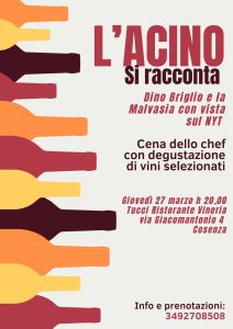 L’appuntamento è quindi fissato per il 27 marzo alle ore 20:00 con “L’Acino si racconta. Dino Briglio e la Malvasia con vista sul NYT”. Per partecipare, è necessaria la prenotazione al numero 3492708508.