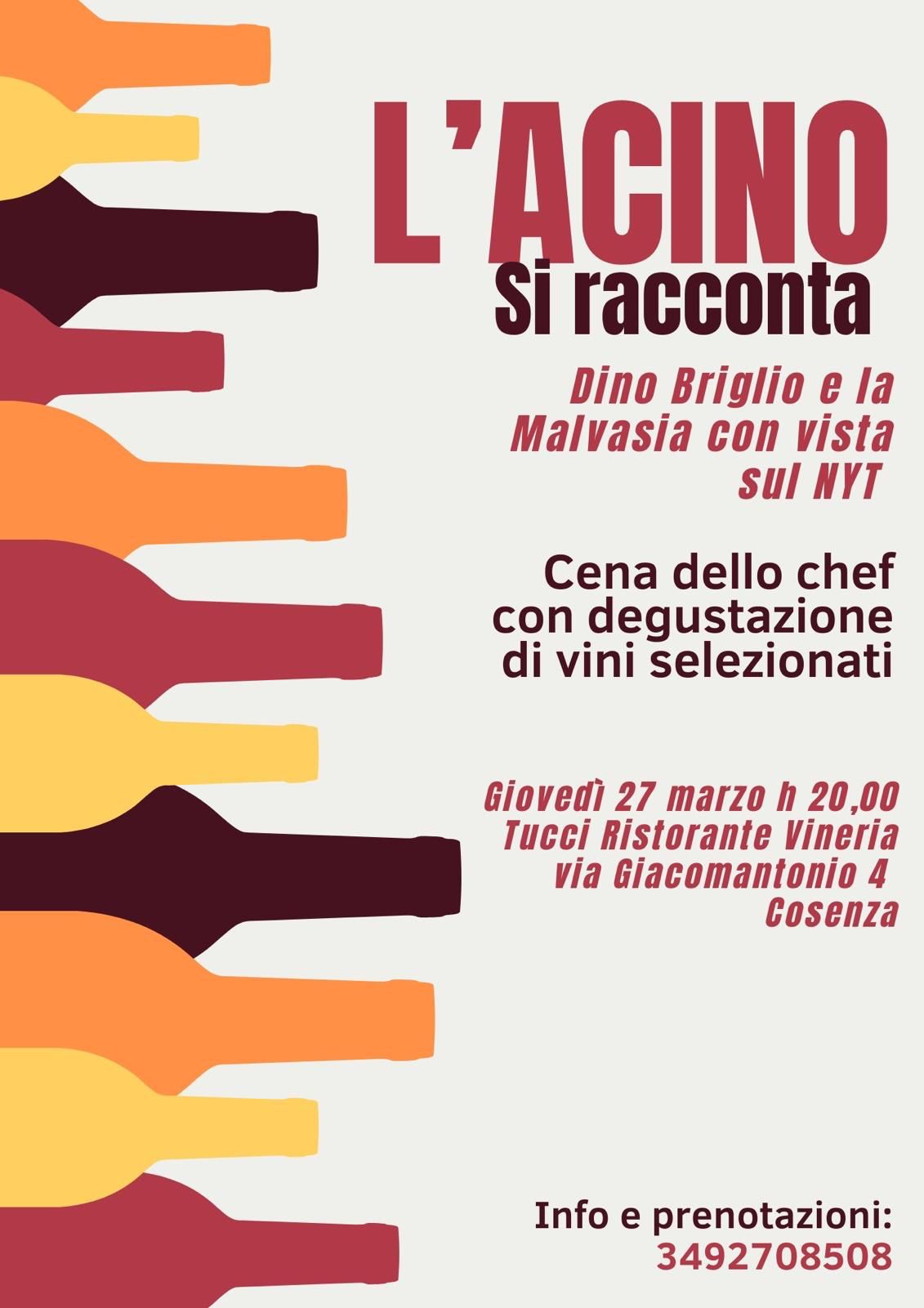 Un viaggio tra sapori autentici e racconti di vita vissuta. Il 27 marzo, alle ore 20, la vineria dei gemelli Tucci in via Stanislao Giacomantonio 4 a Cosenza ospiterà il primo di una serie di incontri che uniscono vino, parole e gastronomia. Protagonista della serata sarà Dino Briglio, fondatore dell’azienda vitivinicola L’Acino, realtà di San Marco Argentano che ha conquistato anche la critica internazionale.