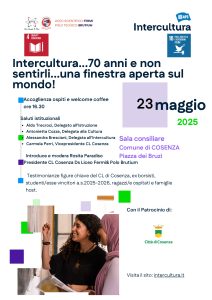 Cosenza celebra i 70 anni di Intercultura. L’iniziativa si terrà domani, venerdì 23 maggio, alle ore 16.30 nella sala Consiliare di Palazzo dei Bruzi. L’evento, patrocinato dal Comune di Cosenza, sarà condotto da Rosita Paradiso Presidente CL Cosenza DS Liceo Fermi & polo Brutium.