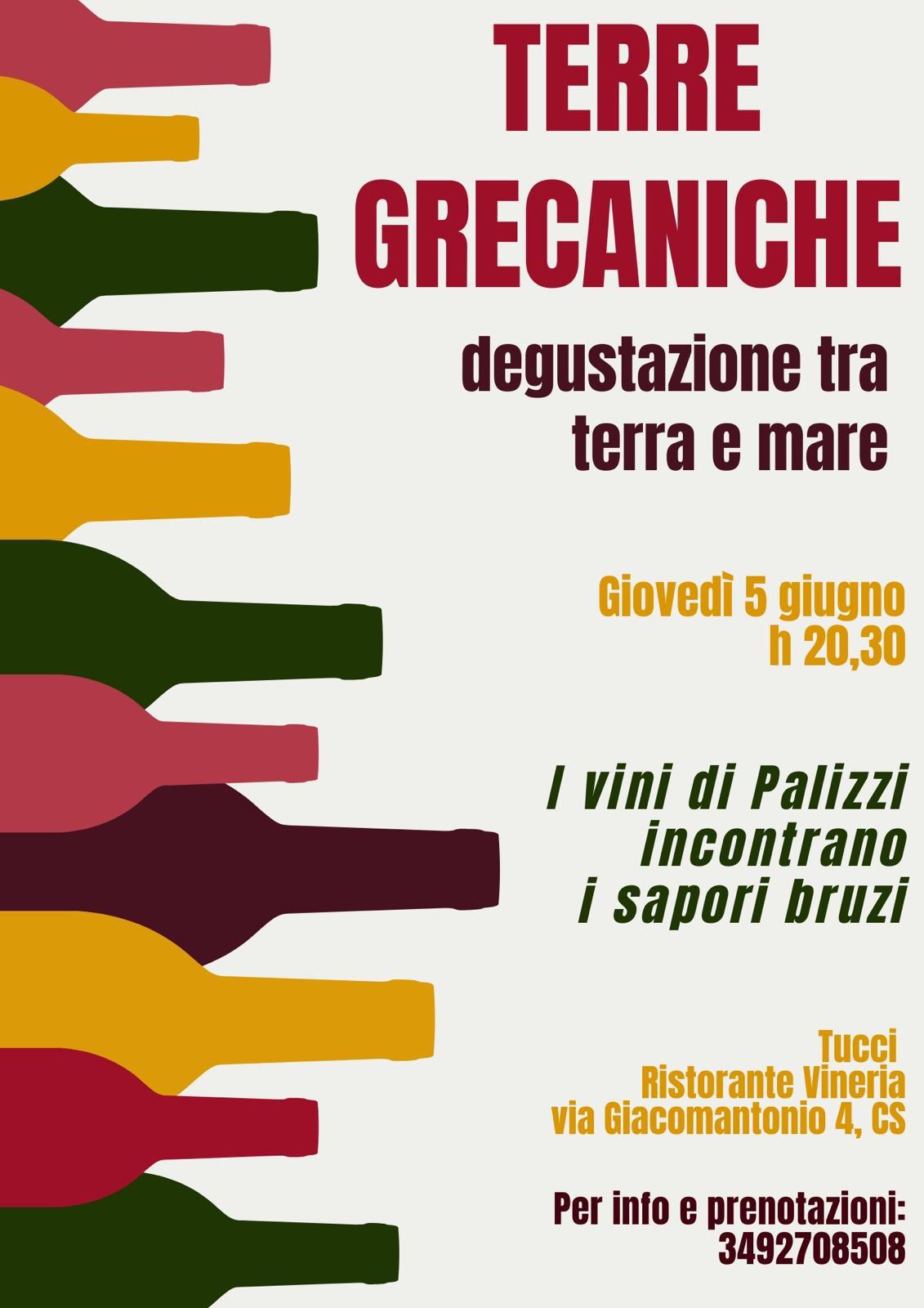 Con Terre Grecaniche proseguono gli incontri con i vignaioli promossi dalla vineria Tucci. Giovedì 5 giugno alle ore 20,30 in via Giacomantonio sarà possibile degustare i vini di Palizzi in abbinamento ai sapori della cucina bruzia. Tra terre e mare il menù scelto dallo chef Tucci per esplorare e conoscere la cultura enologica della Calabria Greca.