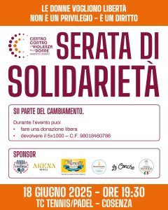 Il Centro Antiviolenza “Roberta Lanzino” di Cosenza organizza un evento speciale per il prossimo 18 giugno, con l’obiettivo di raccogliere fondi a sostegno delle sue attività, che da anni offrono supporto alle donne vittime di violenza. L’iniziativa, intitolata “Sii parte del cambiamento”, si terrà presso la sede del TC Tennis Padel di Cosenza a partire dalle 19:30 e prevede una serata di solidarietà all’insegna della consapevolezza e del sostegno attivo.