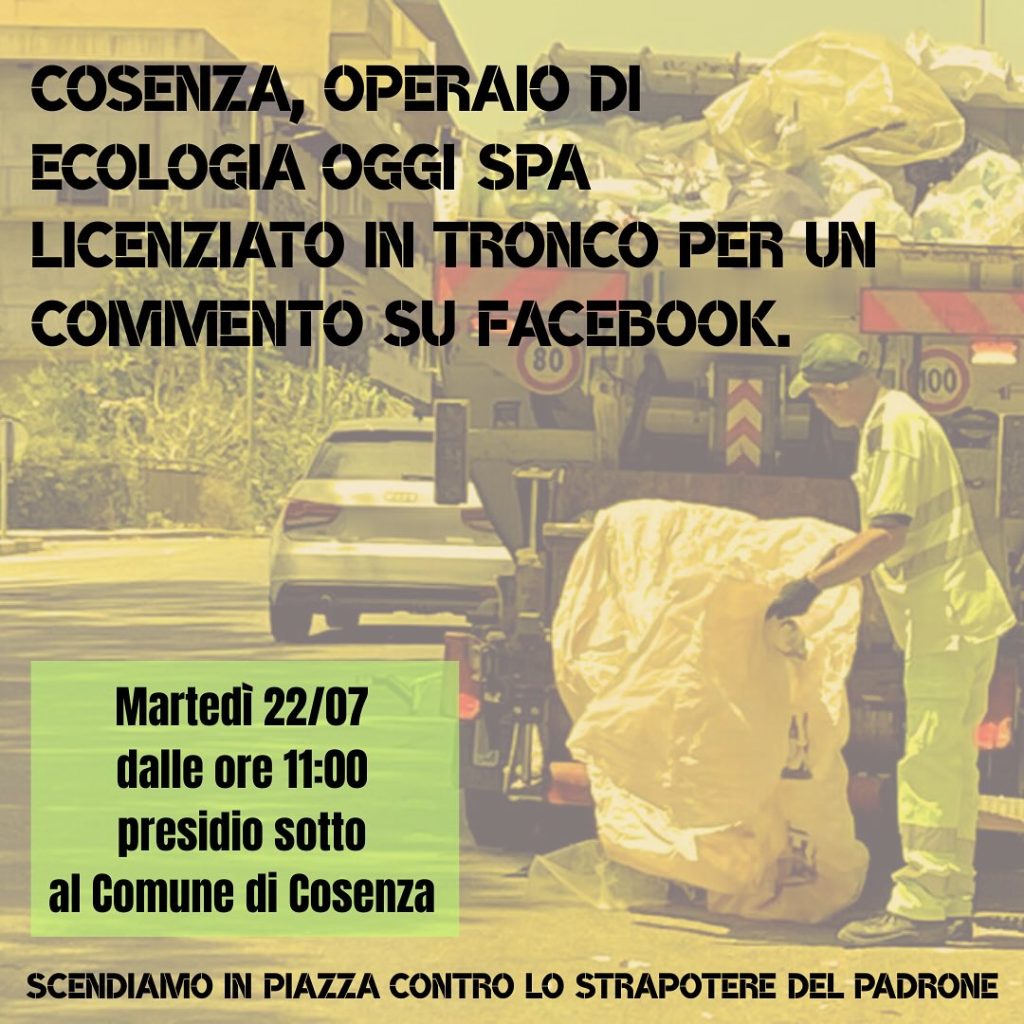 Cosenza, presidio sotto il Comune contro il licenziamento di un lavoratore di Ecologia Oggi Spa