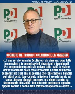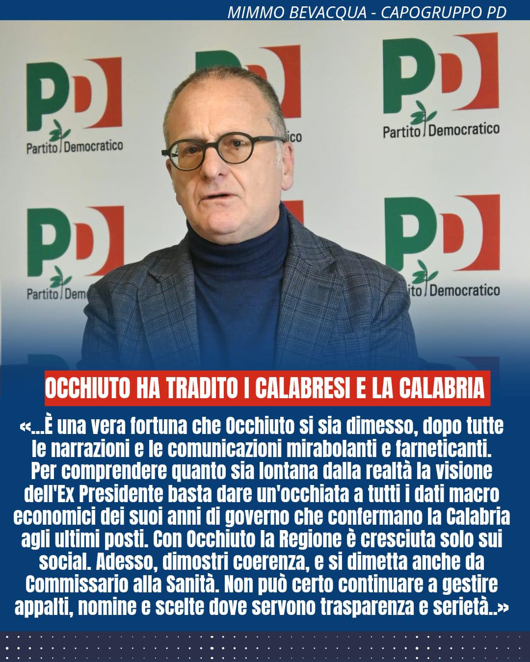 «È una vera fortuna che Occhiuto si sia dimesso, dopo tutte le narrazioni e le comunicazioni mirabolanti e farneticanti». Lo ha scritto sui profili social Mimmo Bevacqua, capogruppo del Partito Democratico alla Regione Calabria a proposito della dimissione del Governatore.