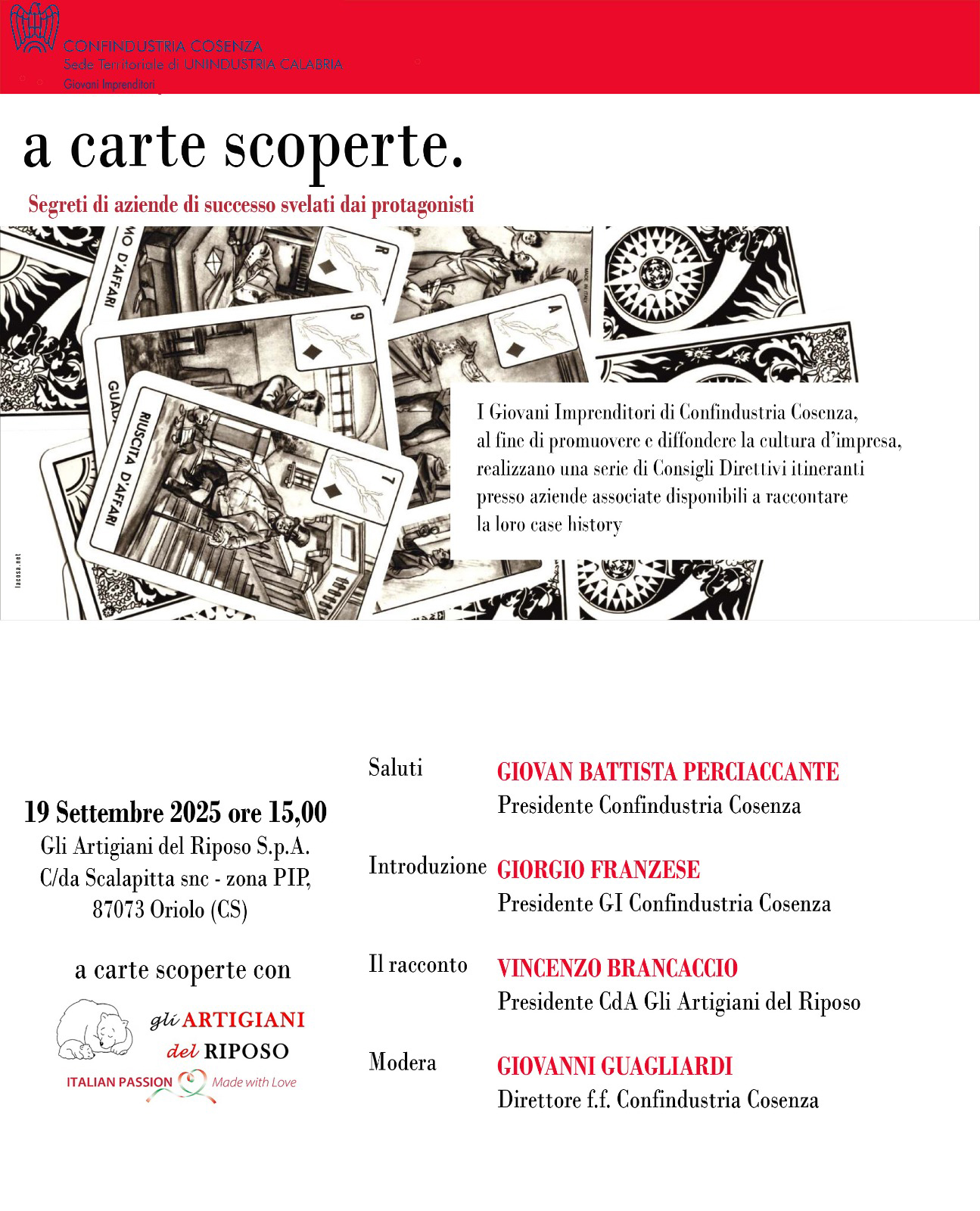 Attraverso il format “A carte scoperte” e il nuovo premio “Radici di Eccellenza”, Oriolo diventa il palcoscenico di una riflessione sul valore dell’impresa come motore di sviluppo per il Sud. «Nel cuore del Meridione, dove spesso si pensa che tutto sia immobile – ha dichiarato Vincenzo Brancaccio – Gli Artigiani del Riposo dimostrano che è possibile ripartire, innovare e creare occupazione. Con questa giornata vogliamo ribadire che il talento e la visione imprenditoriale sono le vere radici per un futuro di eccellenza».