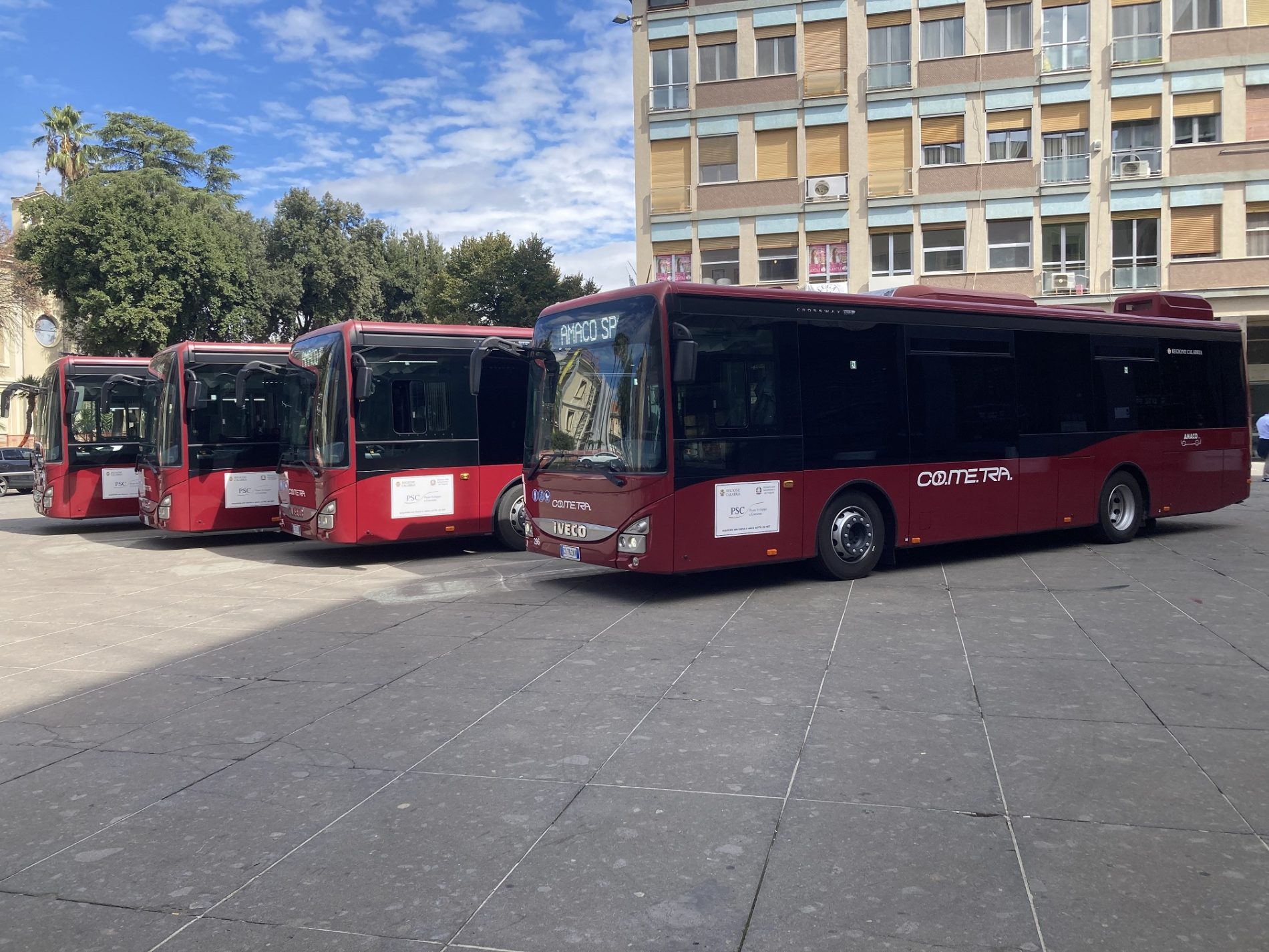 Alla consegna dei mezzi, oltre al sindaco Franz Caruso, erano presenti l’assessore regionale ai trasporti, il presidente del Consiglio di amministrazione di Co.Me.Tra. Aristide Vercillo, il curatore della liquidazione giudiziale di Amaco, Fernando Caldiero e il direttore generale di Amaco, Francesco La Valle.