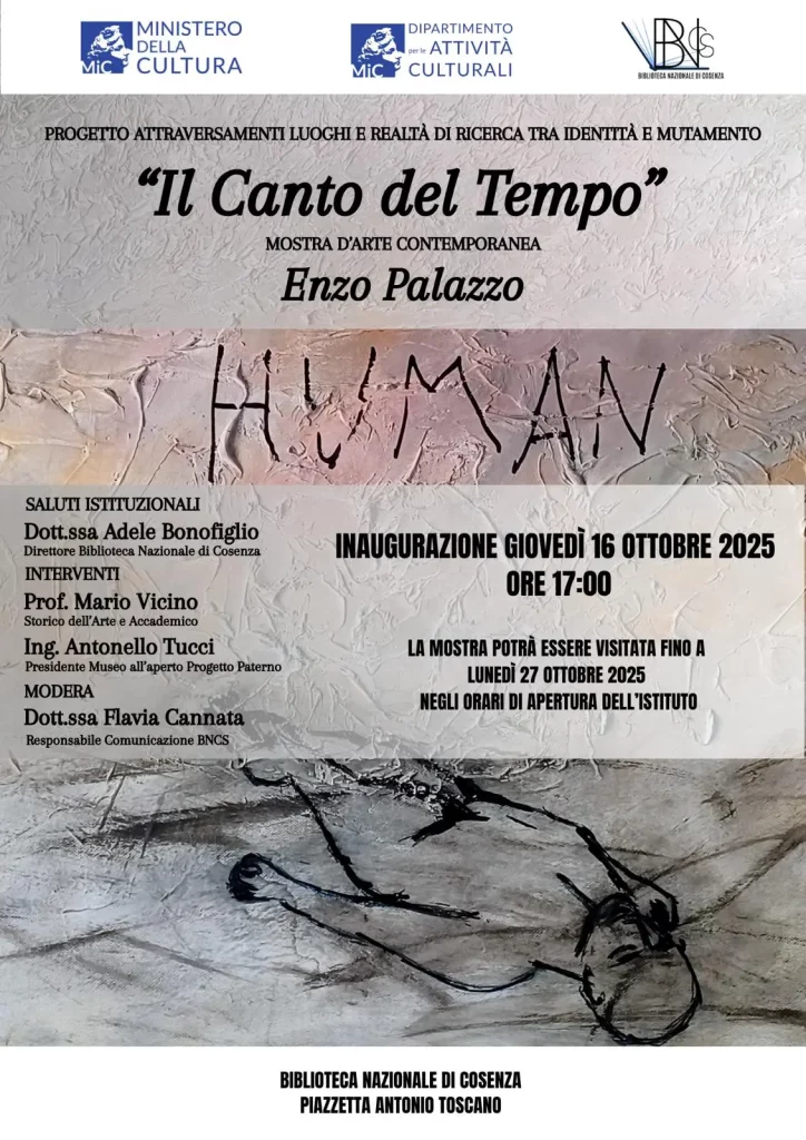 Giovedì 16 ottobre 2025, alle ore 17:00, la Biblioteca Nazionale di Cosenza ospita l’inaugurazione della mostra “Il Canto del Tempo” dell’artista Enzo Palazzo. L’esposizione, allestita nella Sala “Giorgio Leone”, presenta oltre 30 opere che esplorano il dialogo tra passato e presente, offrendo uno sguardo poetico e riflessivo sul rapporto tra memoria e contemporaneità.
