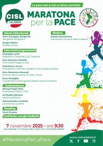 La Cisl Calabria lancia un forte messaggio di pace e solidarietà, partecipando attivamente alla “Maratona per la Pace”, il percorso promosso a livello nazionale dal sindacato in tutte le Regioni italiane, e che culminerà a Roma il prossimo 15 novembre con l’Assemblea Nazionale. La tappa calabrese si terrà venerdì 7 novembre a Pizzo, presso l’aula magna dell’Istituto Nautico in via Riviera Prangi, a partire dalle ore 9:30.