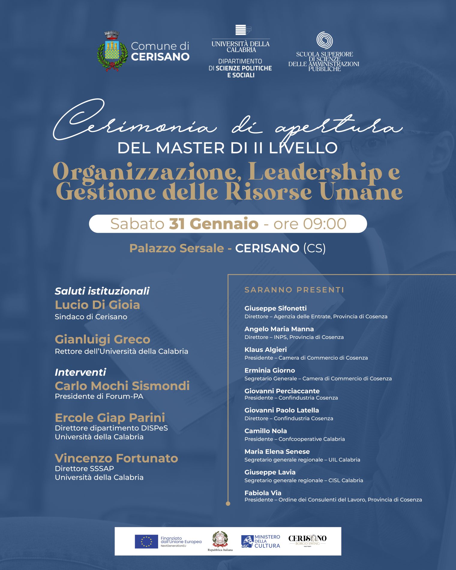 Cerisano si conferma luogo di formazione avanzata e dialogo tra Università e territorio. Sabato 31 gennaio, alle ore 9.00, presso Palazzo Sersale, si terrà la cerimonia di apertura e presentazione del Master di II livello in “Organizzazione, Leadership e Gestione delle Risorse Umane”, promosso dall’Università della Calabria – Dipartimento di Scienze Politiche e Sociali e dalla Scuola Superiore delle Scienze delle Amministrazioni Pubbliche, in collaborazione con il Comune di Cerisano.