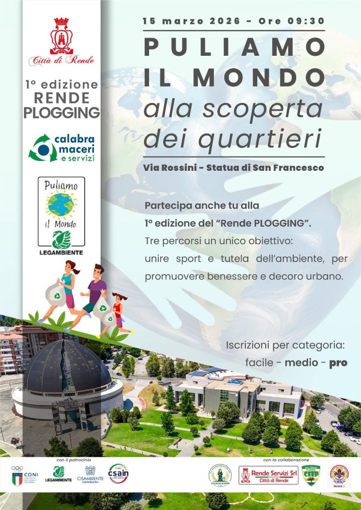 L’impegno per l’ambiente incontra la pratica sportiva nella prima edizione di “Rende Plogging”, versione cittadina della storica campagna “Puliamo il Mondo”. L’appuntamento è fissato per domenica 15 marzo, a partire dalle ore 9:30, per una mattinata dedicata alla cura del territorio attraverso una disciplina nata in Svezia e ormai diffusa a livello internazionale.