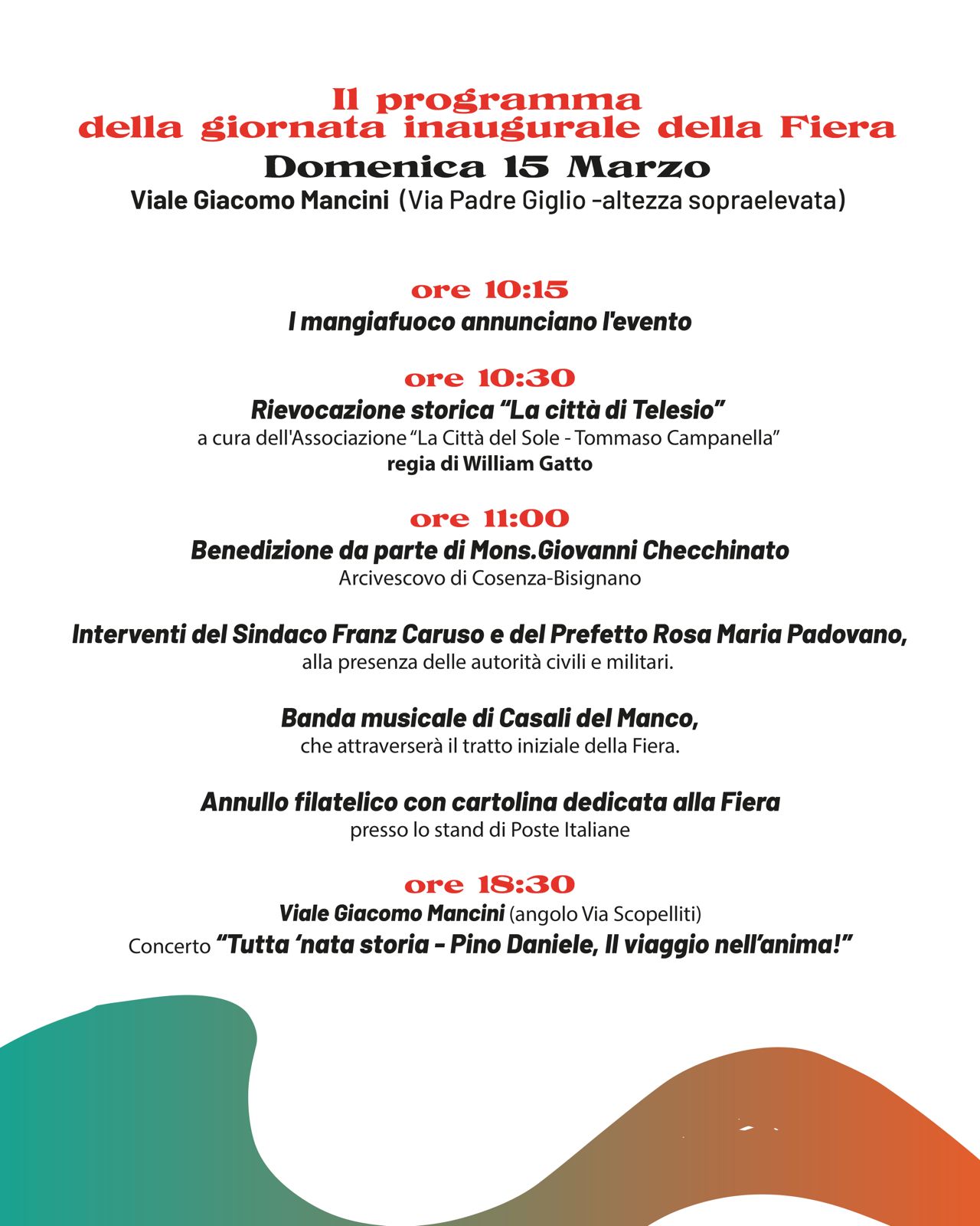 Il protocollo istituzionale prevede la benedizione apostolica di S.E. Mons. Giovanni Checchinato, Arcivescovo di Cosenza-Bisignano, alla presenza del Sindaco Franz Caruso e del Prefetto Rosa Maria Padovano. Il corteo inaugurale tra i viali della fiera sarà scandito dalle note della Banda musicale di Casali del Manco. Per i collezionisti, è inoltre previsto un momento dedicato presso lo stand di Poste Italiane per l’annullo filatelico sulla cartolina commemorativa dell’evento.